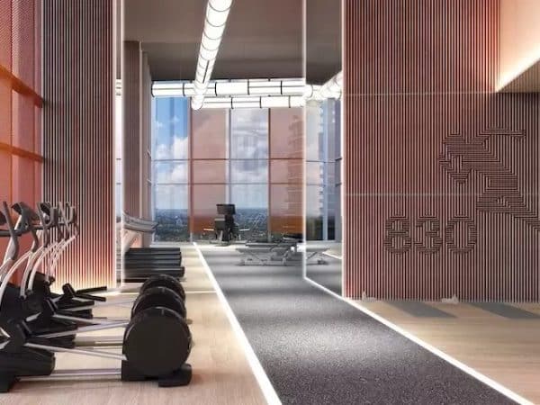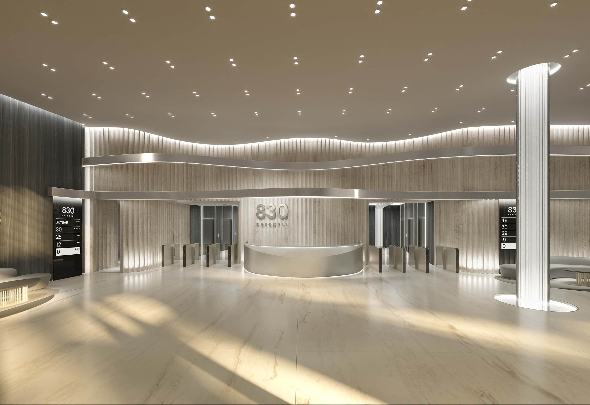 The eight-story parking garage at 830 Brickell acts as the tower’s podium and is wrapped in a kinetic wall, a sprawling sheet of aluminum squares that move in the wind while reflecting the movement and light of the downtown Miami neighborhood.